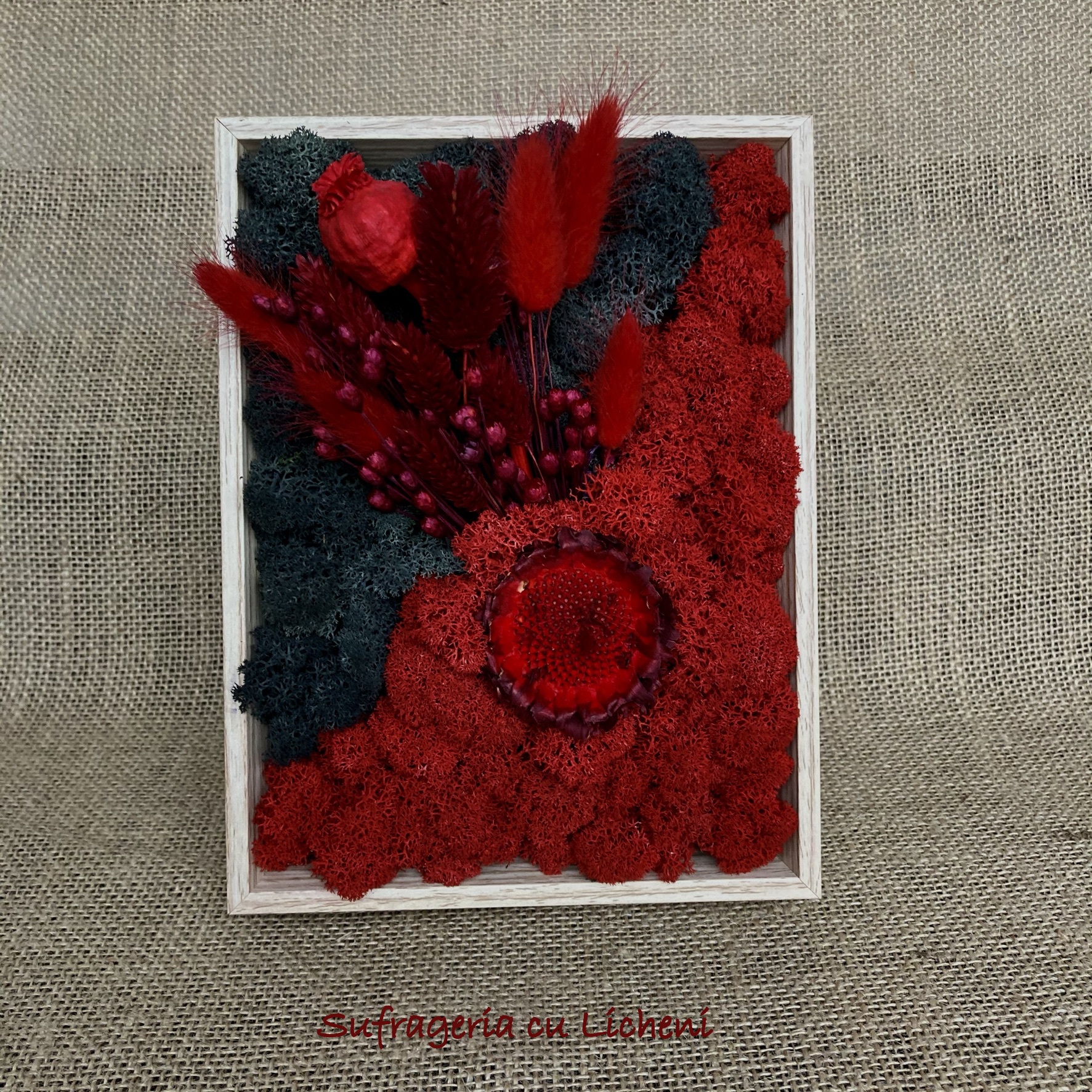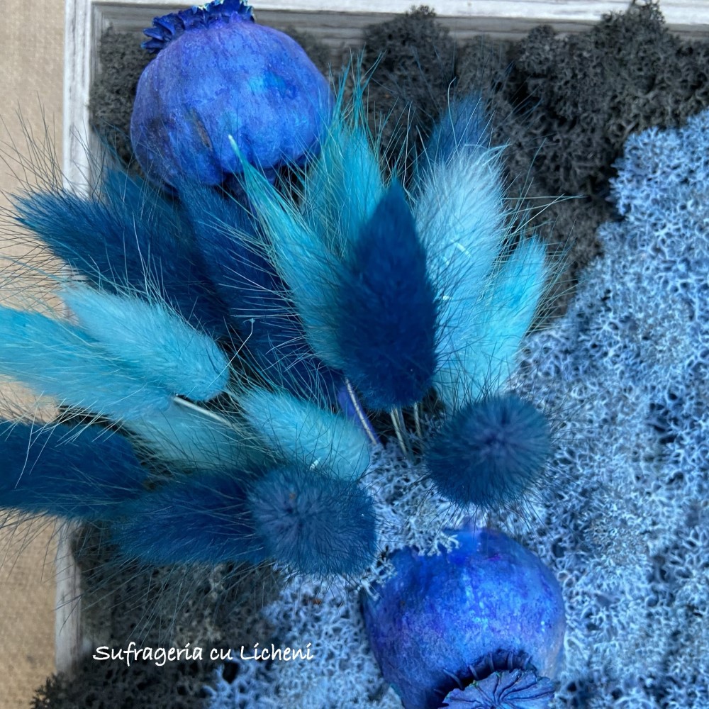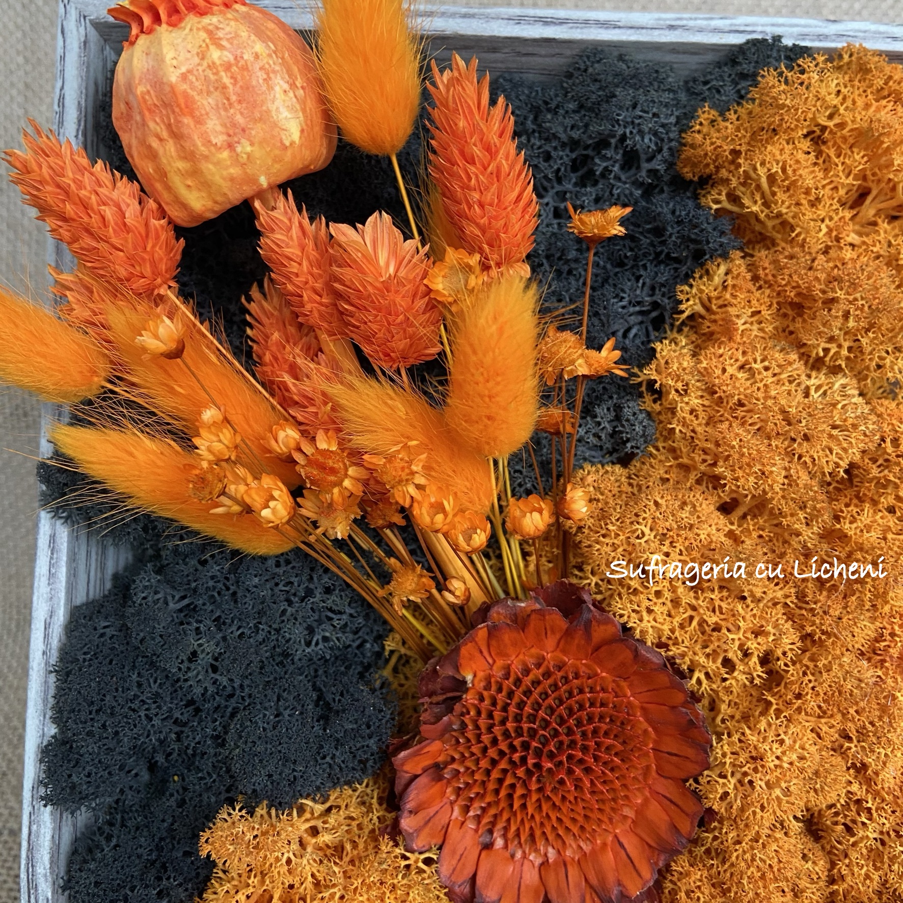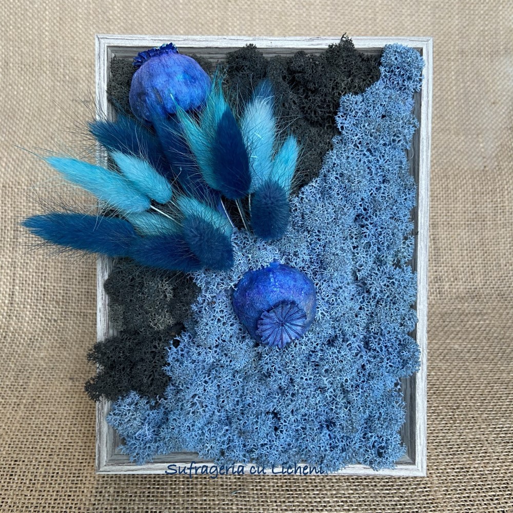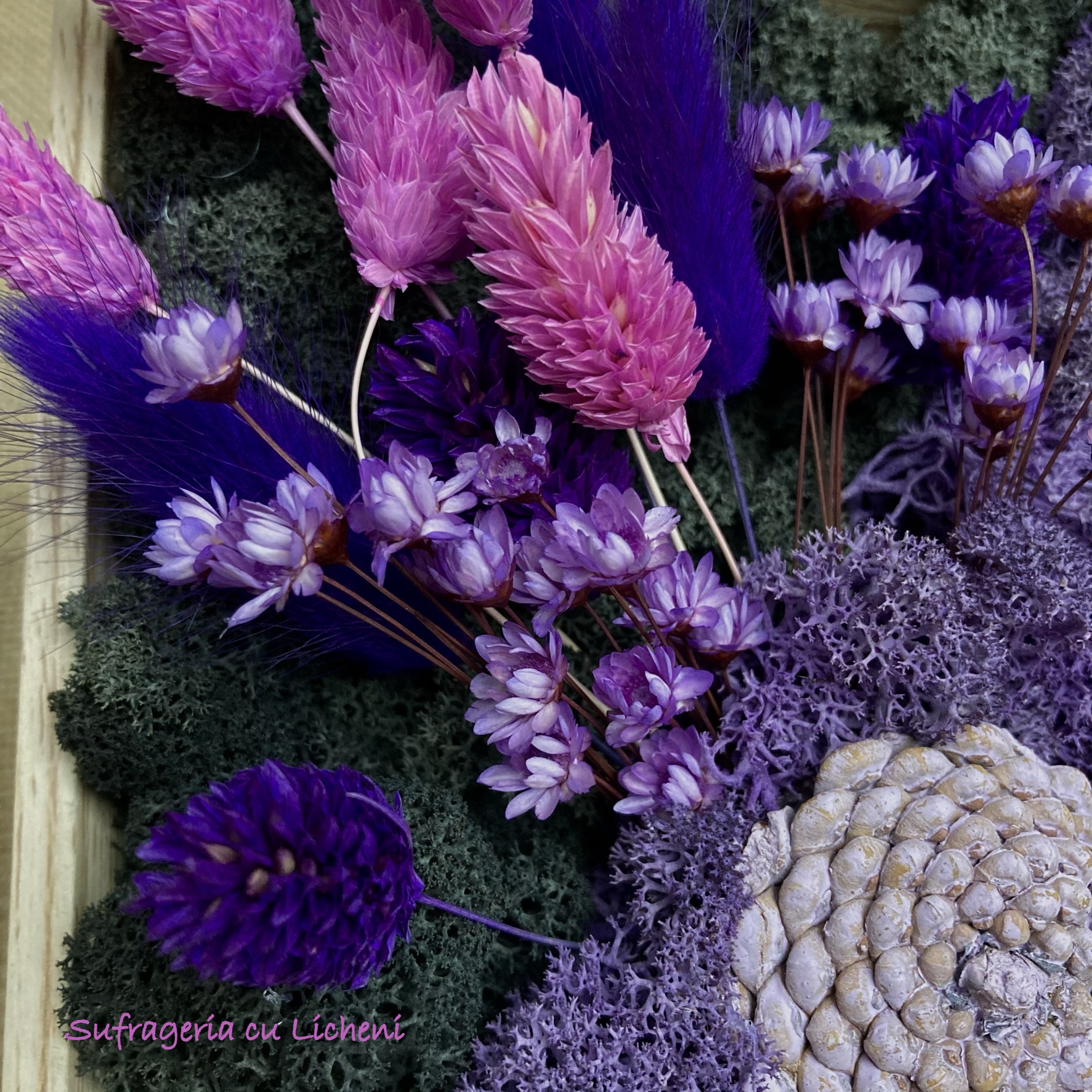 Materiale: Licheni stabilizați, flori uscate și stabilizate.