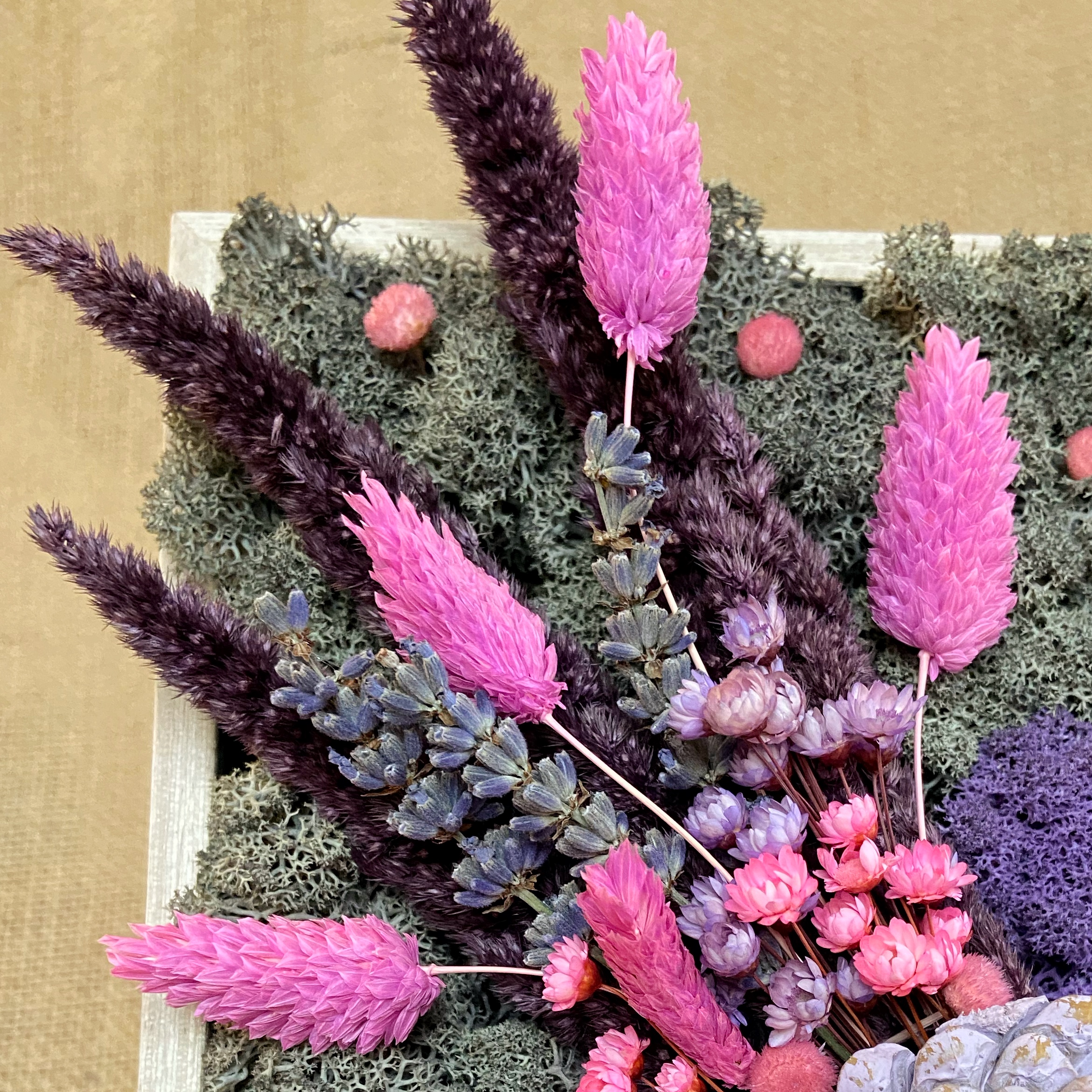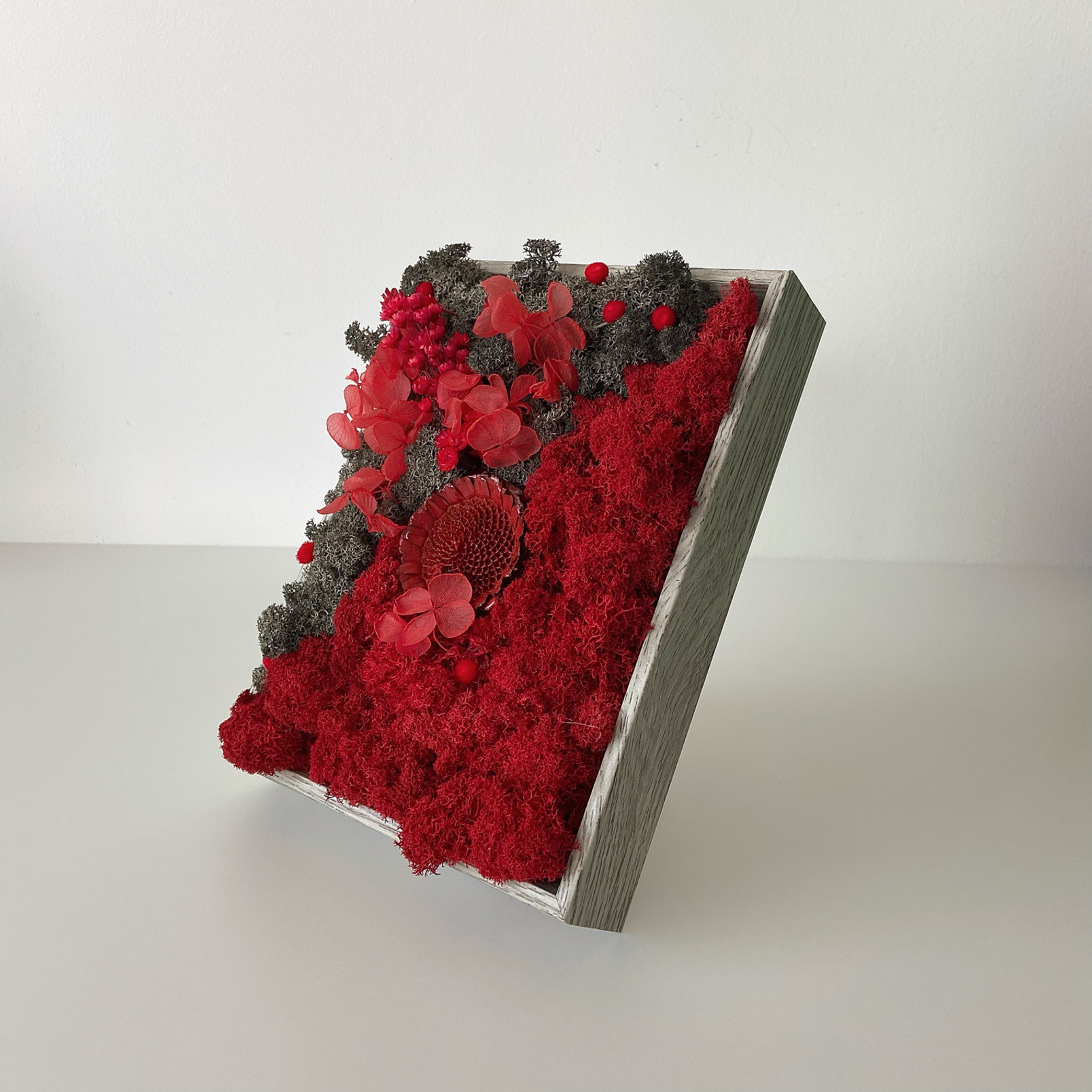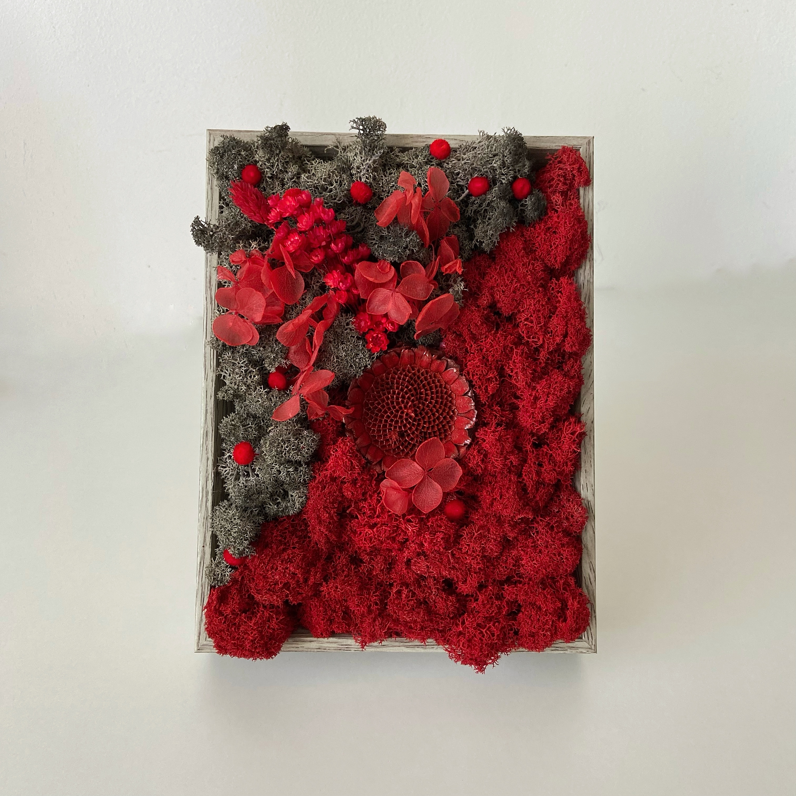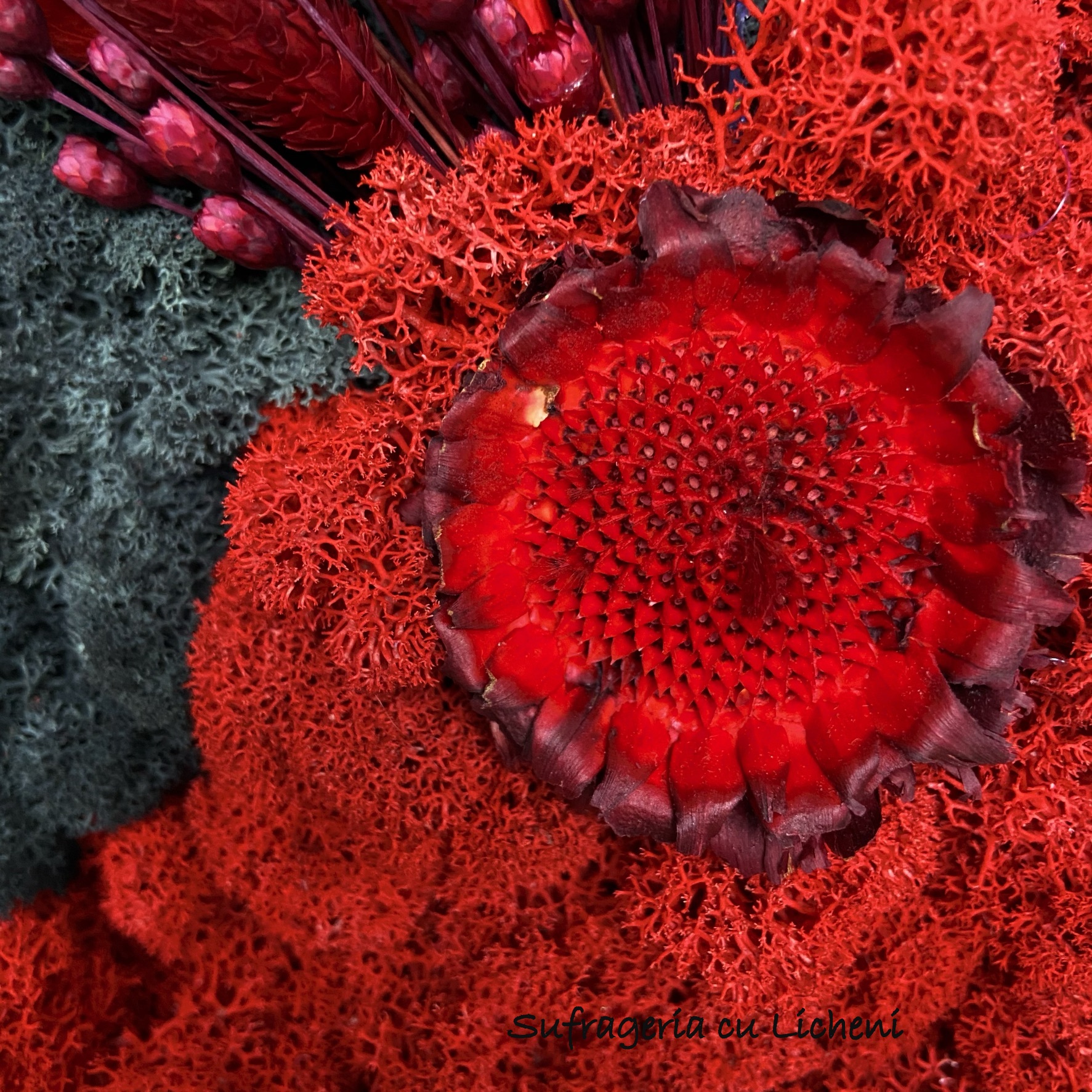 Materiale: Licheni stabilizați, flori uscate și stabilizate.