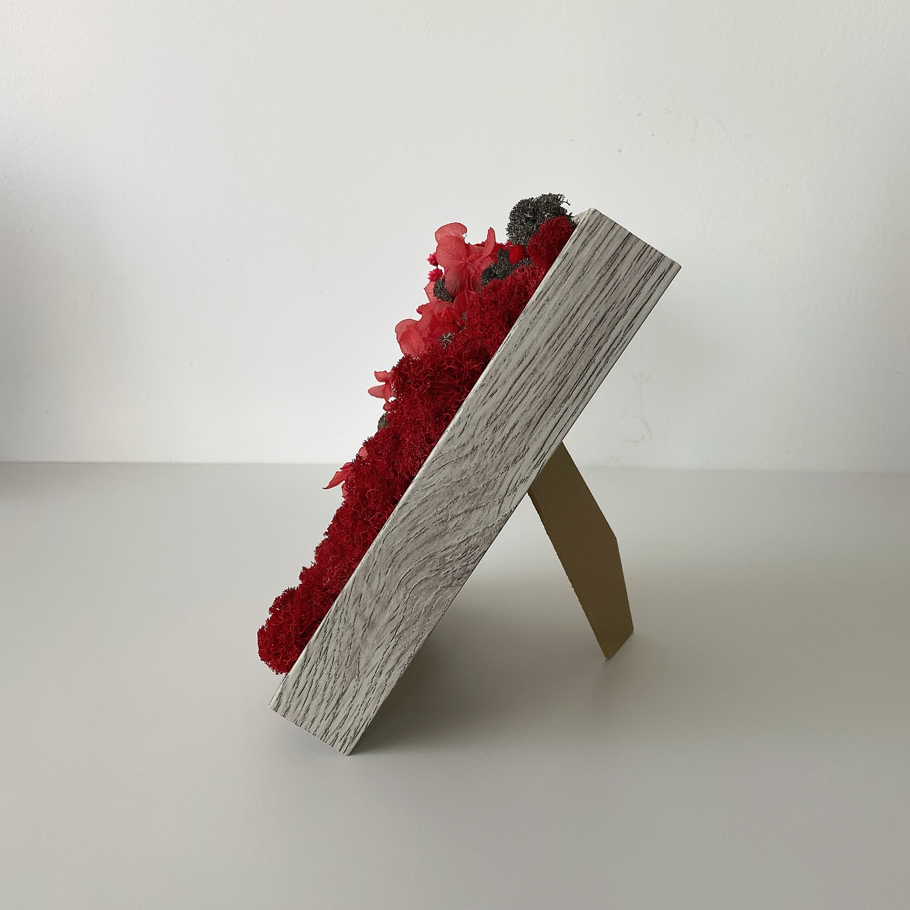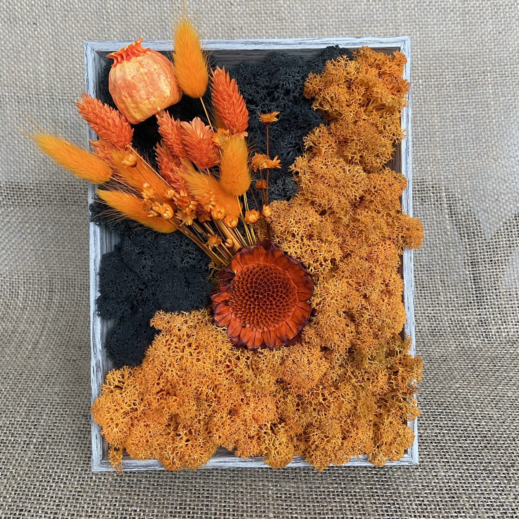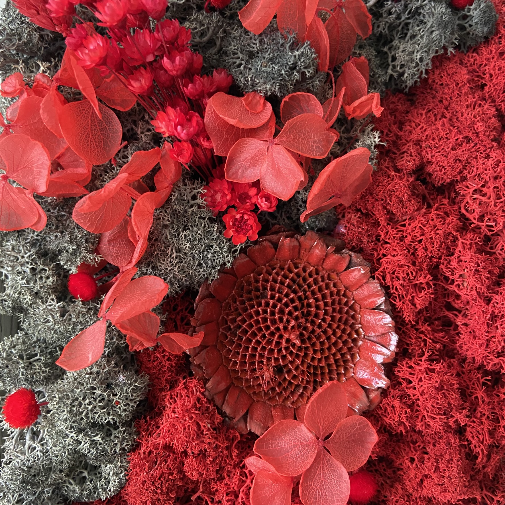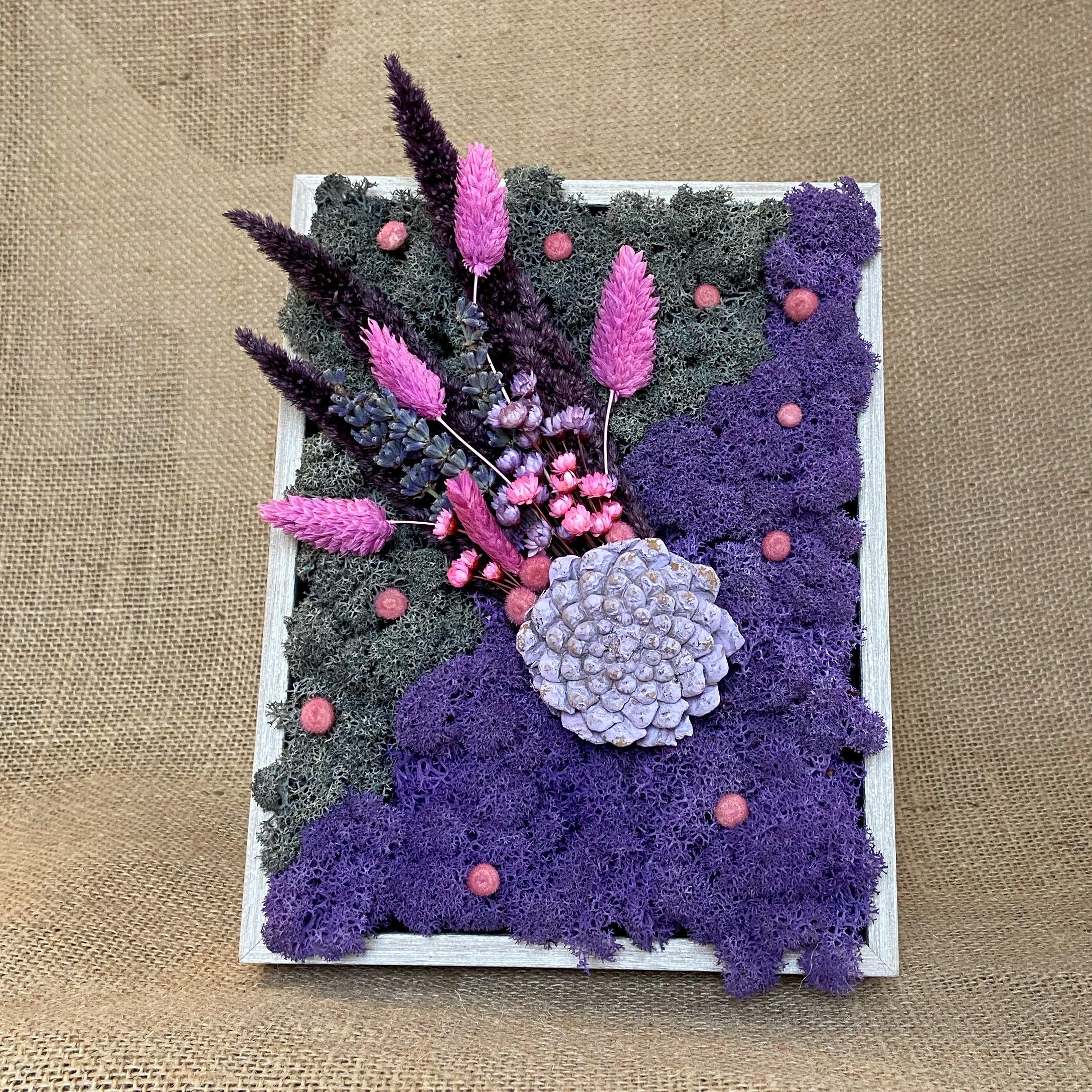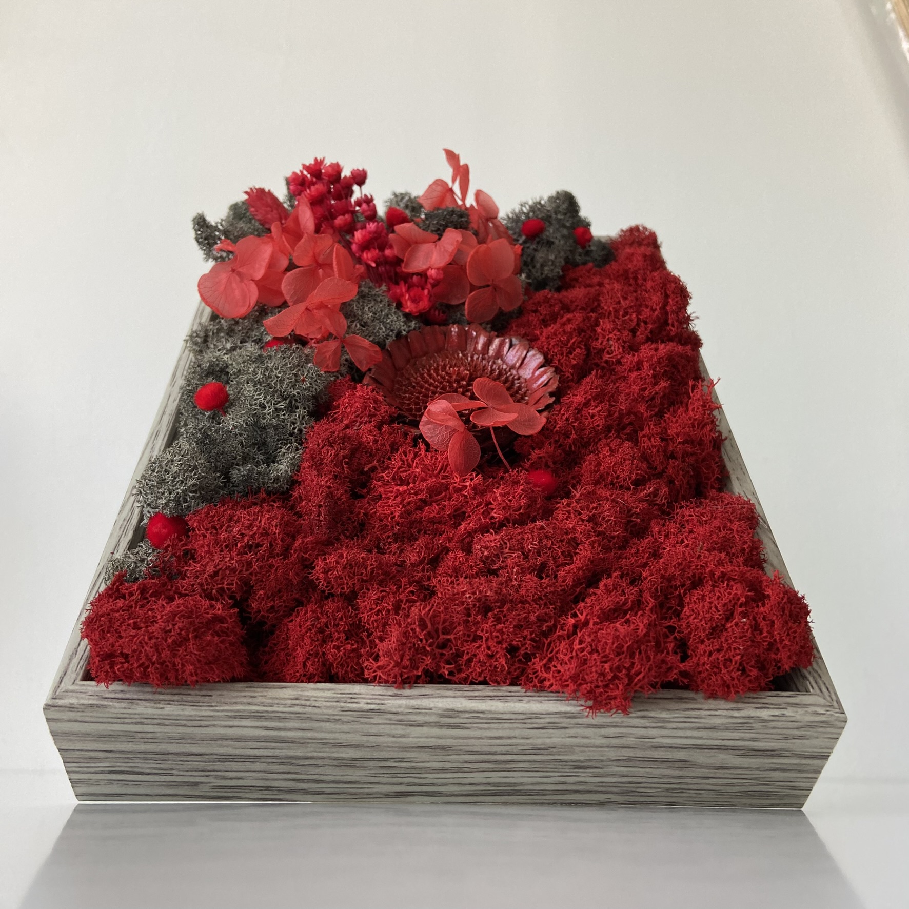 Materiale: Licheni stabilizați, flori uscate și stabilizate.