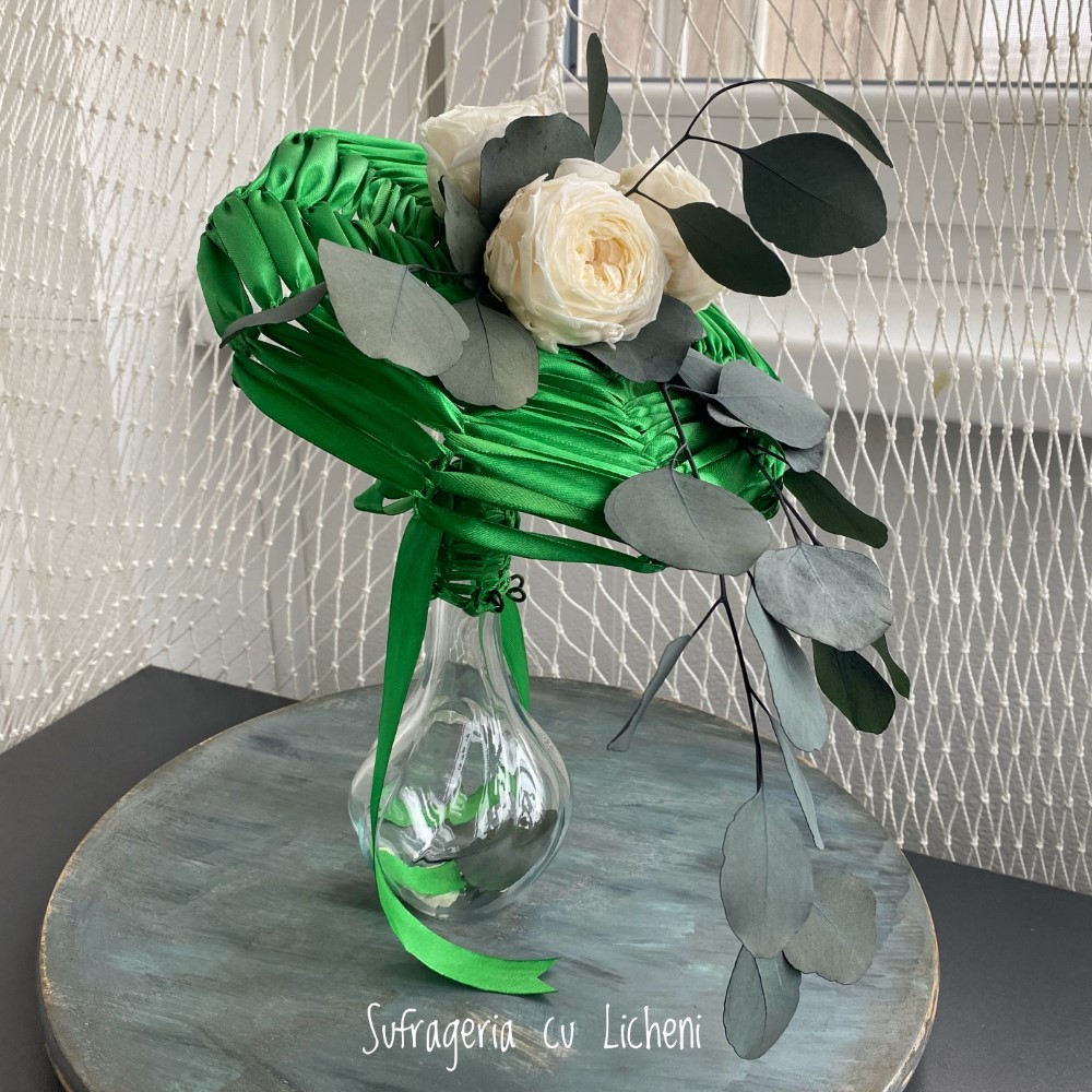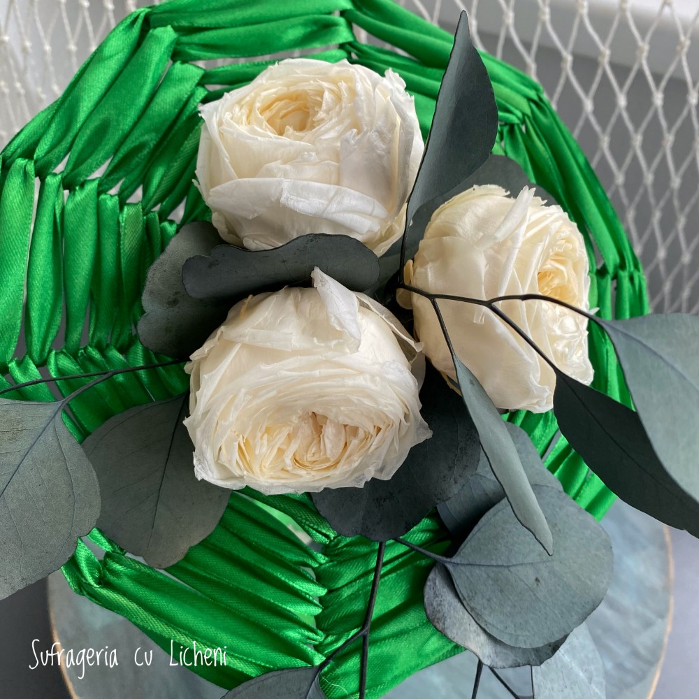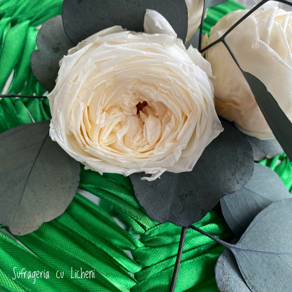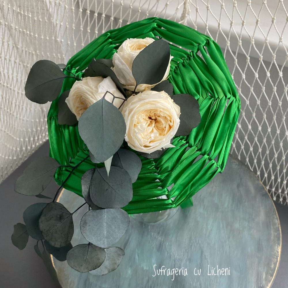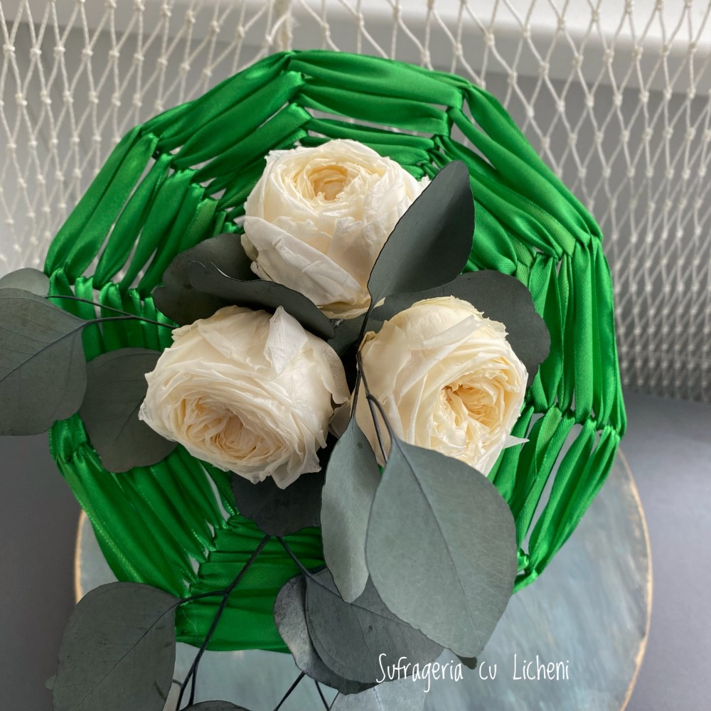 Materiale: Bujori stabilizați, eucalipt stabilizat. Aranjament creat pe structură spider-web.