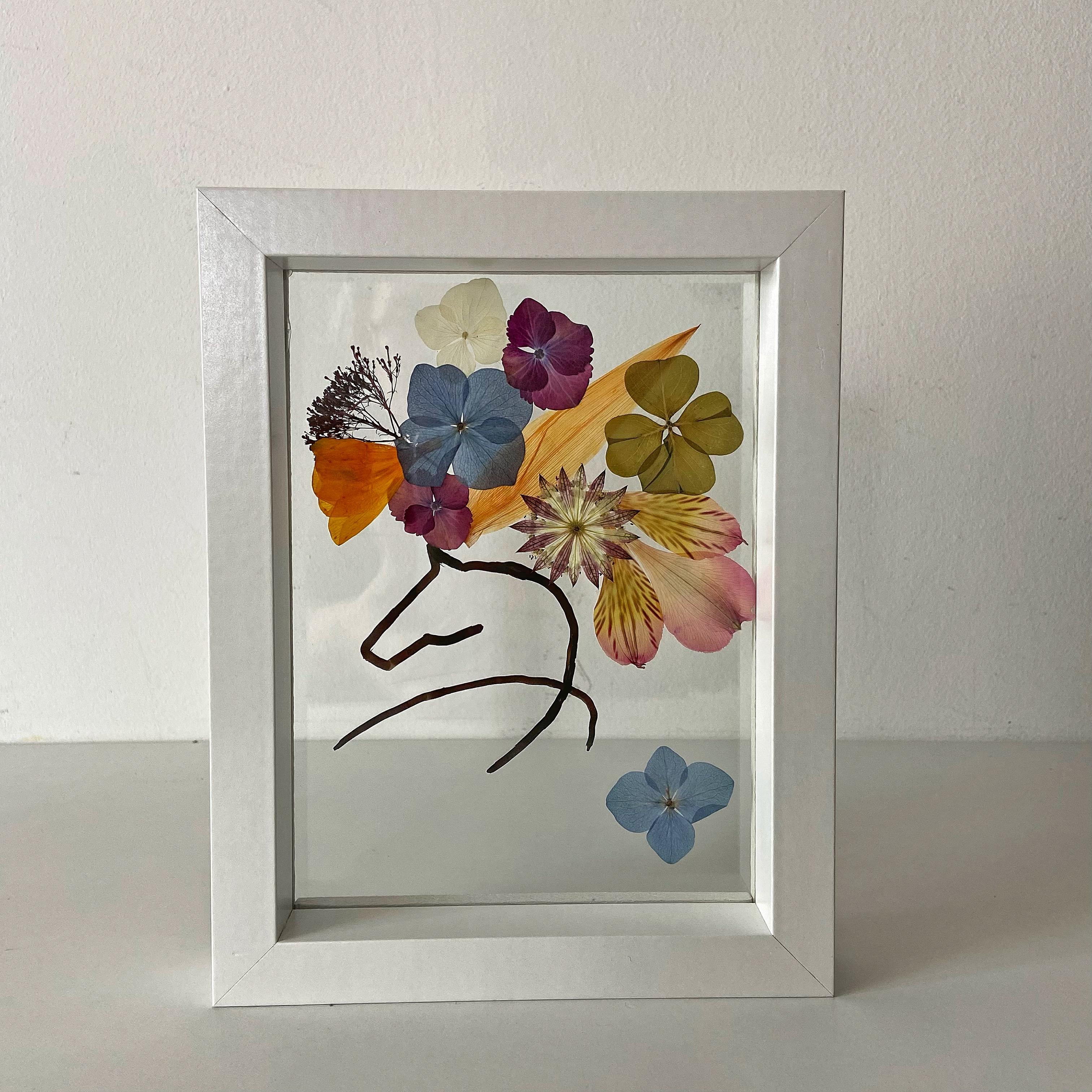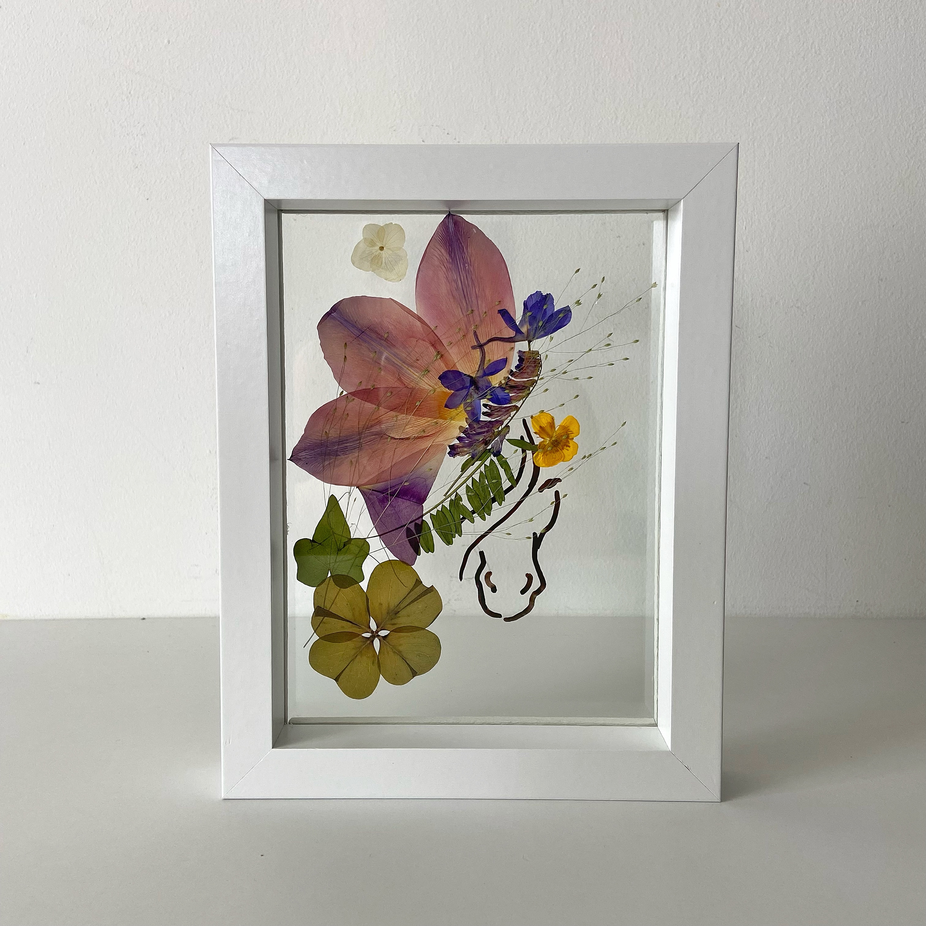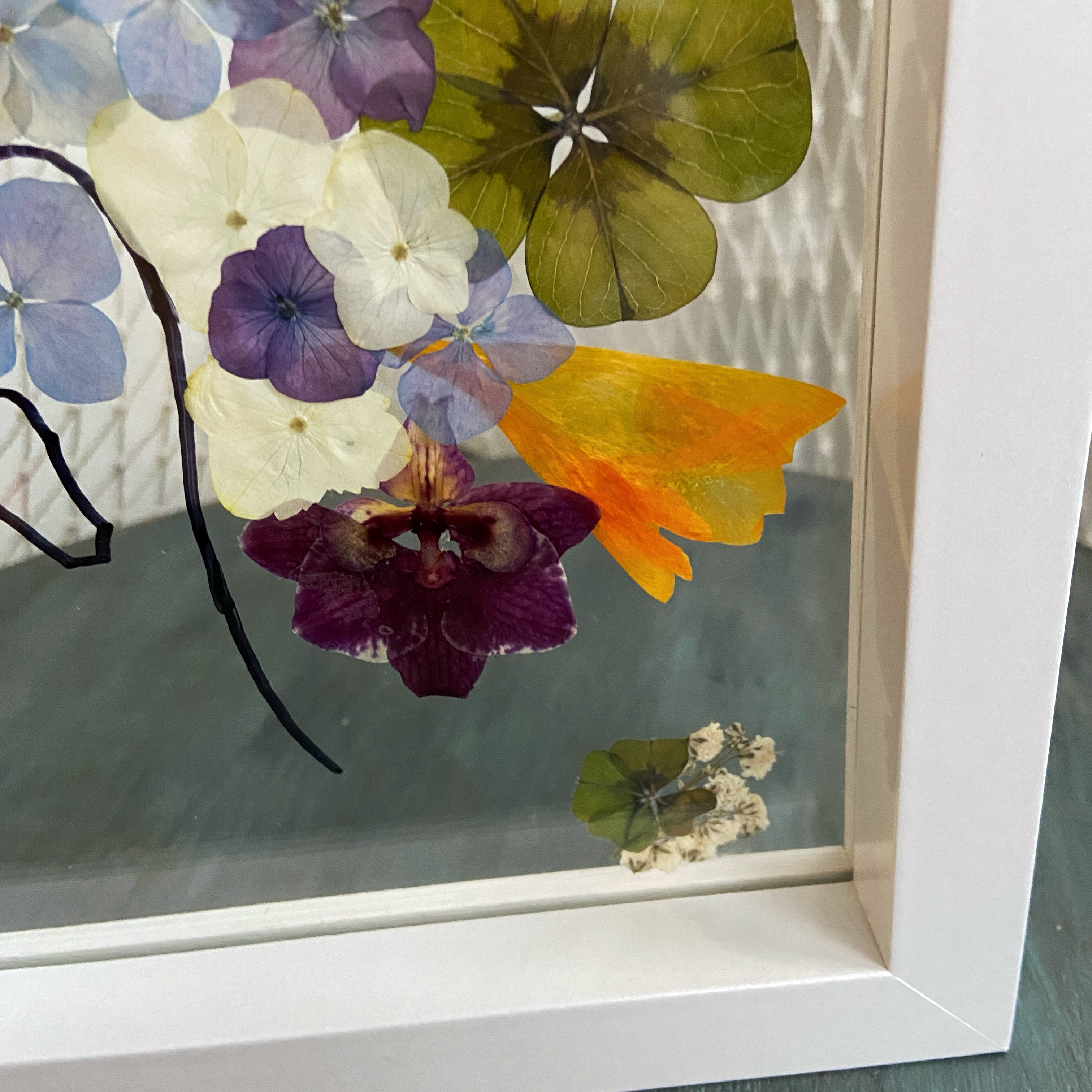 Materiale: Flori naturale presate, foliaj: Frezie, eustoma, orhidee, gypsophila, hydrangea, oxalis.