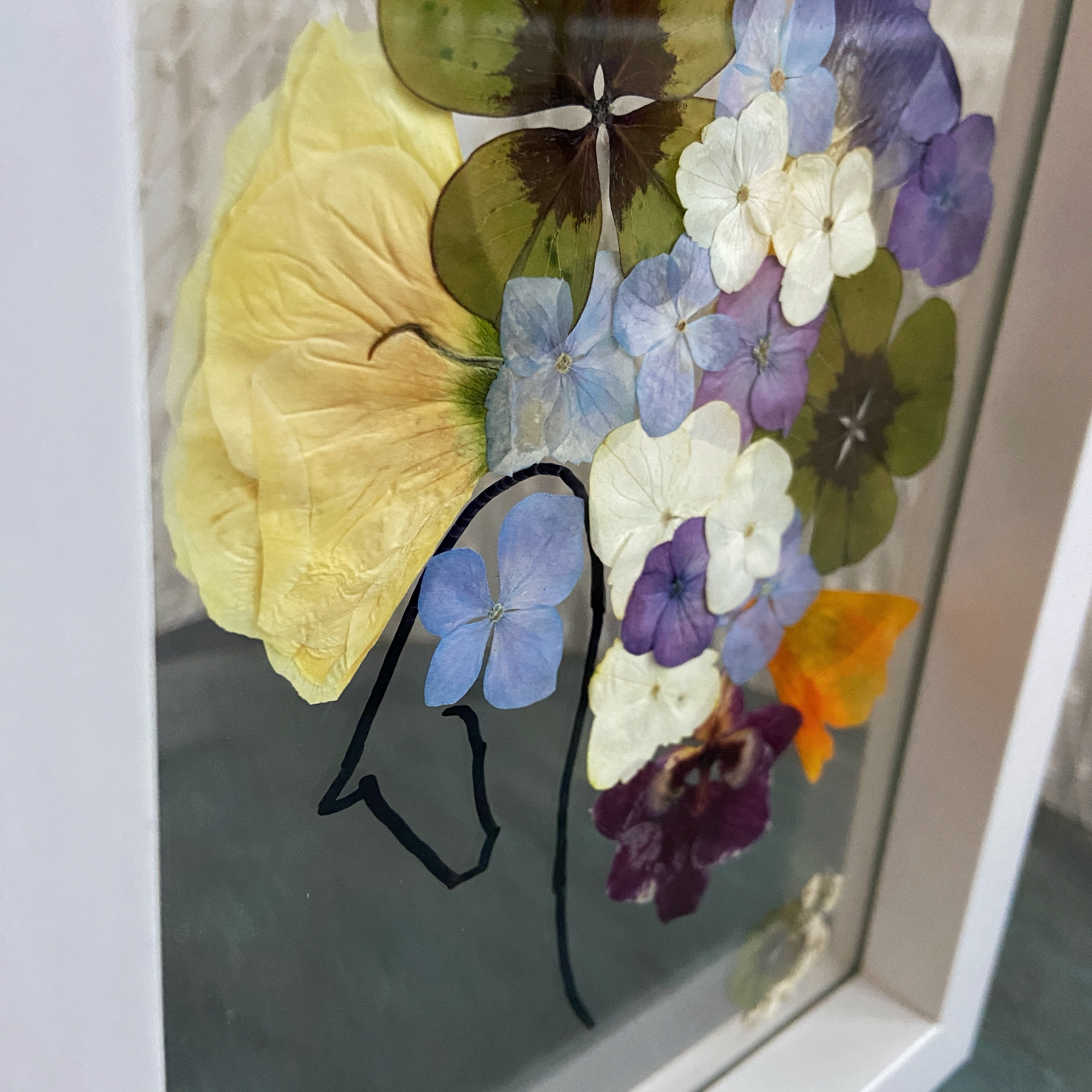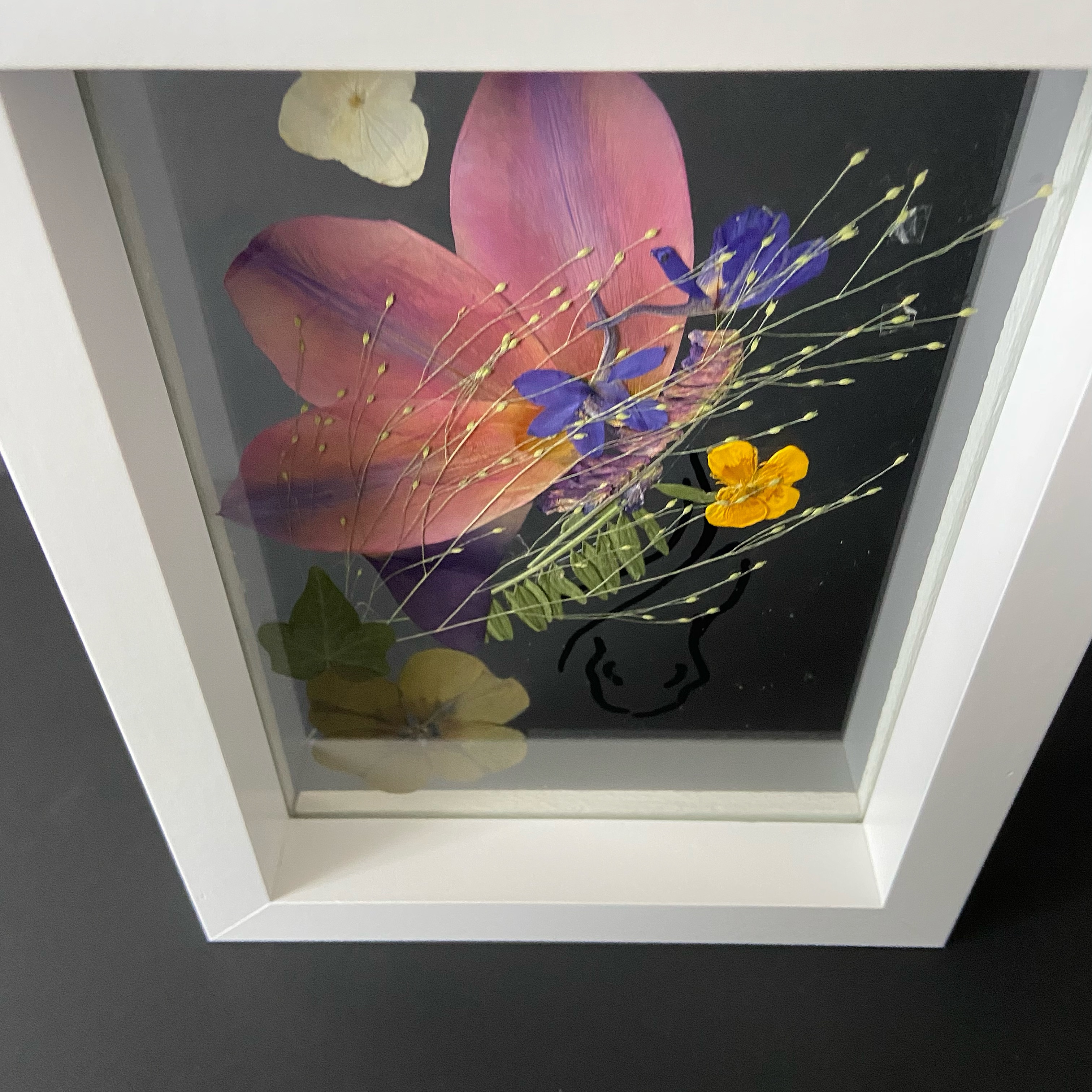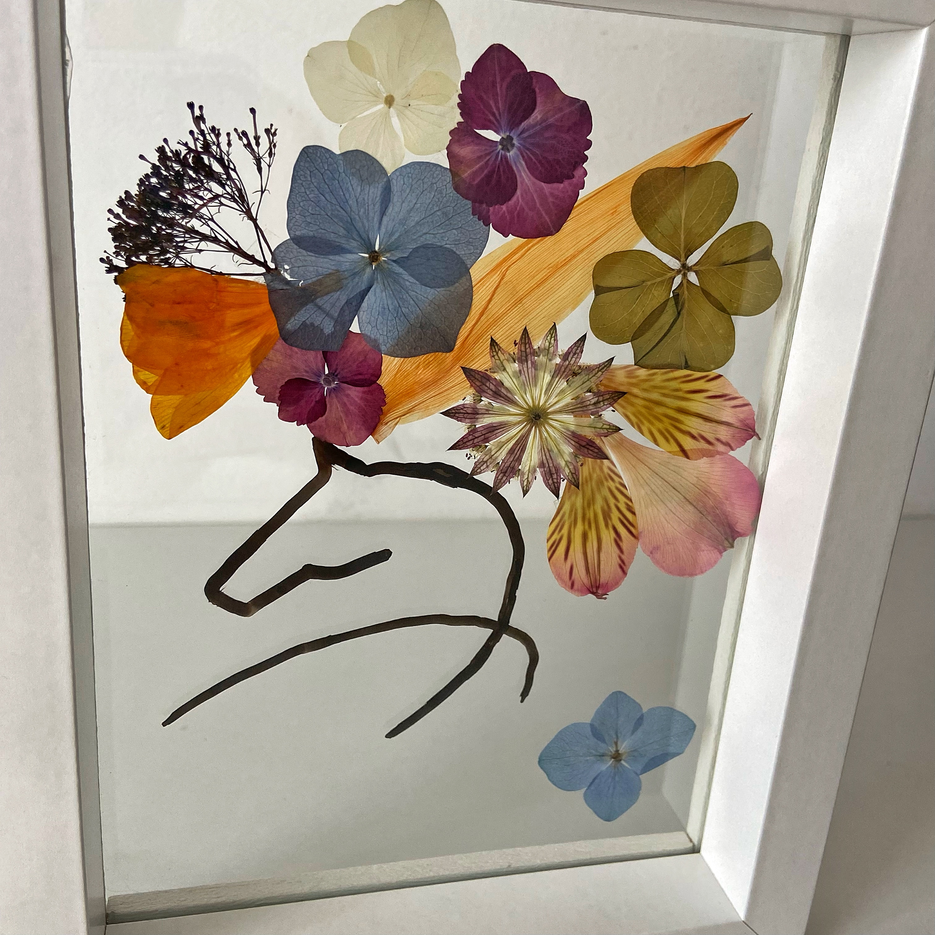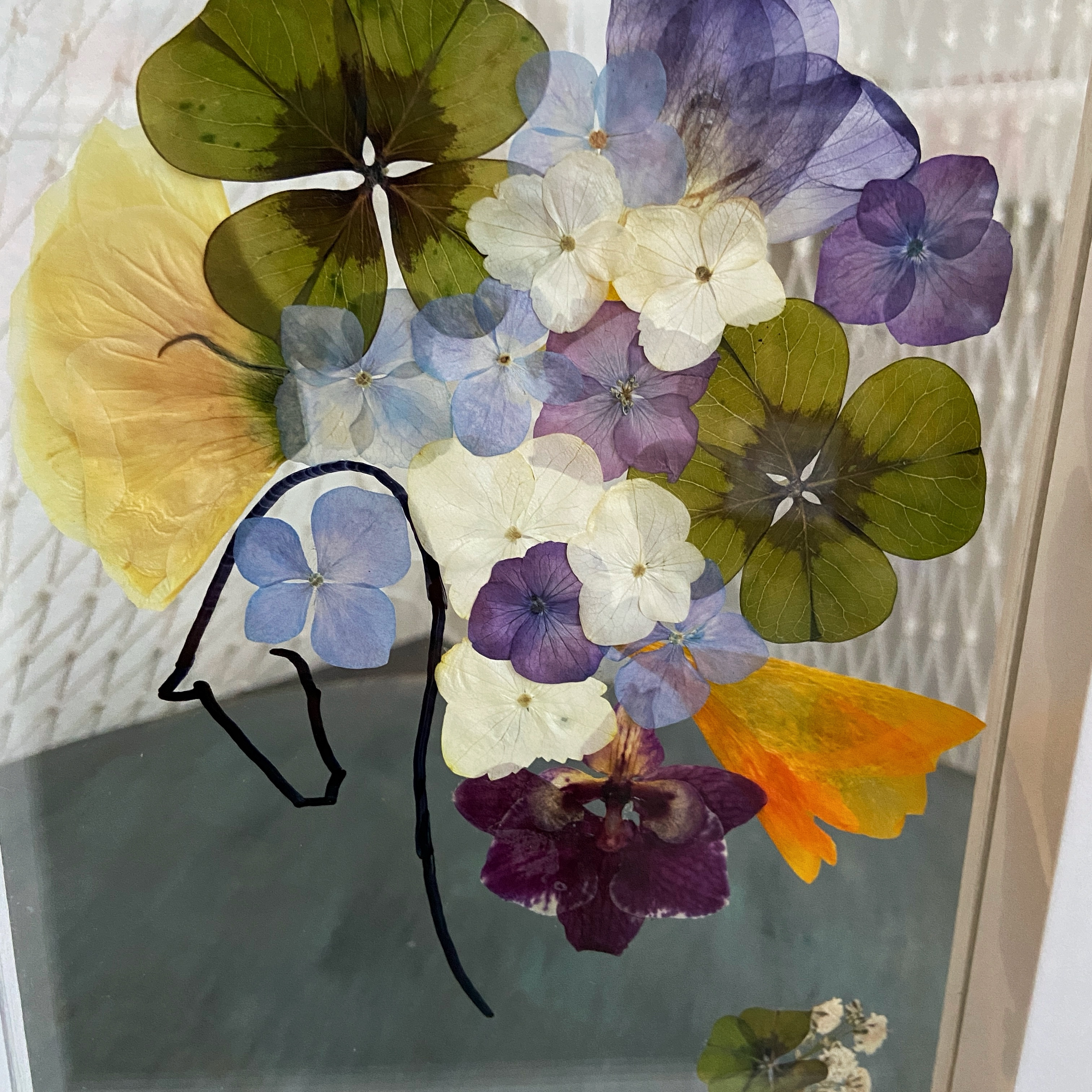 Materiale: Flori naturale presate, foliaj: Frezie, eustoma, orhidee, gypsophila, hydrangea, oxalis.