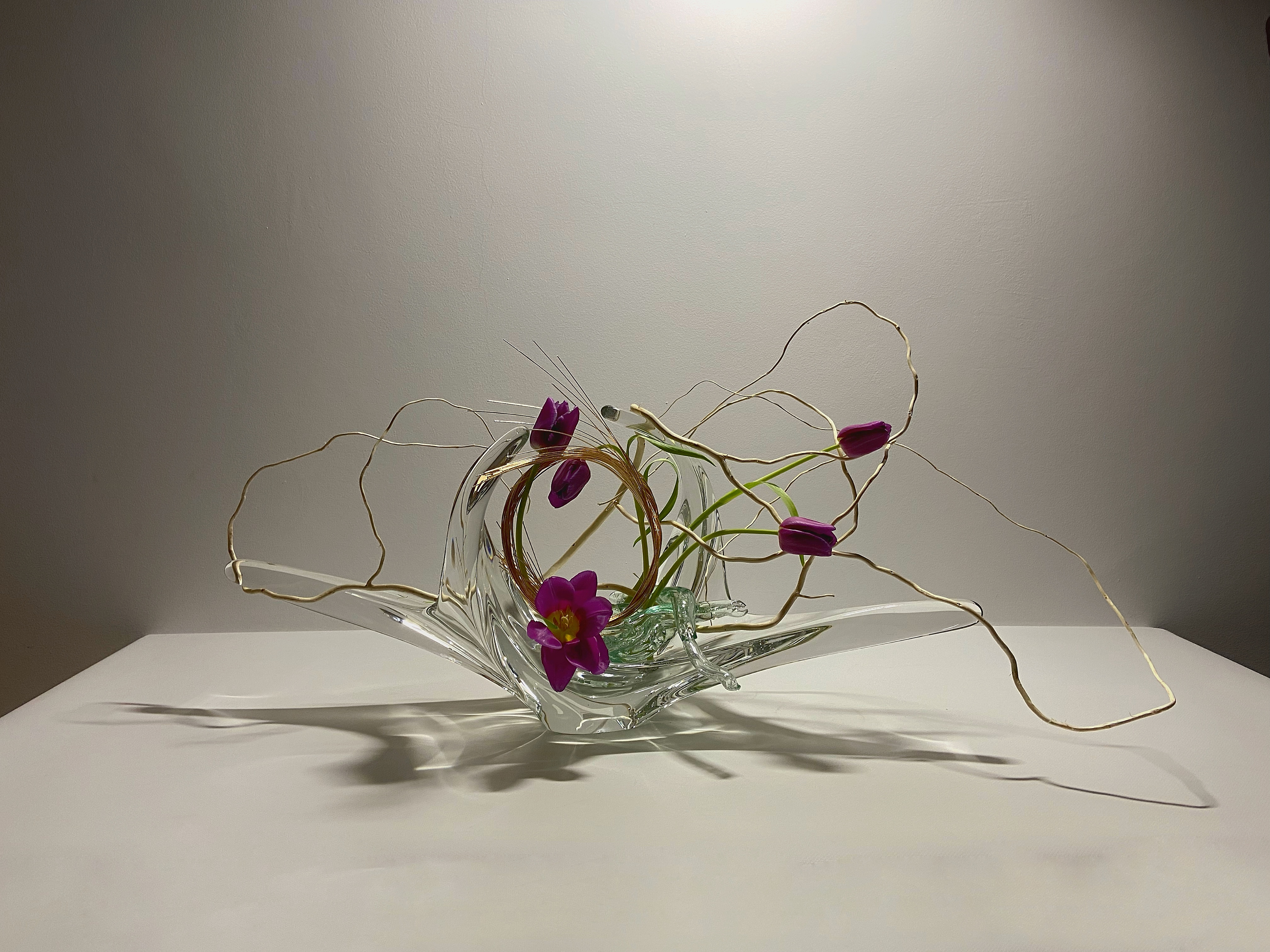 Lucrarea premiată a fost realizată într-un vas de sticlă transparent, completată de o structură fină din crenguțe de salcie creață si sticlă ce susțin mișcarea florilor. Ea reflectă ideea de energie controlată, de dialog între fragilitate și forță, între lumina interioară și forma vizibilă – o expresie a căutării mele continue de armonie între om și natură.